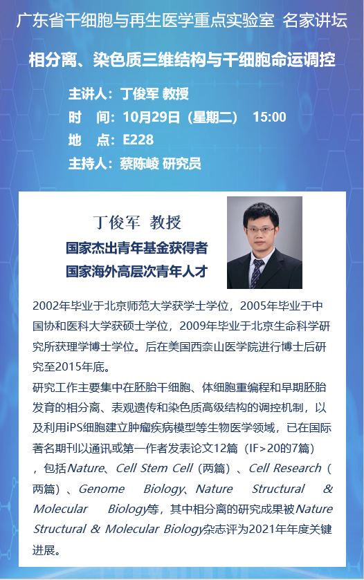 2024年10月29日廣東省干細(xì)胞與再生醫(yī)學(xué)重點實驗室名家講壇:相分離、染色質(zhì)三維結(jié)構(gòu)與干細(xì)胞命運調(diào)控