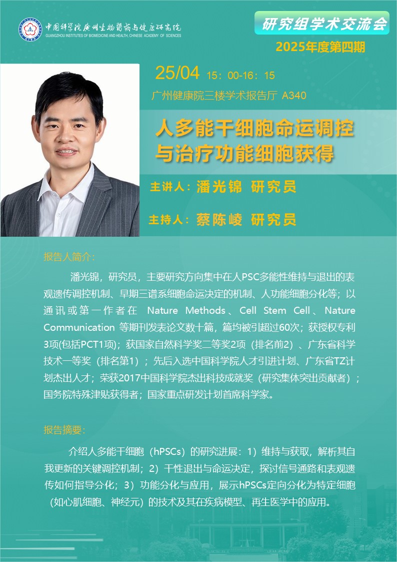 2025年4月25日研究組學(xué)術(shù)交流會(huì)(2025年度第四期):人多能干細(xì)胞命運(yùn)調(diào)控與治療功能細(xì)胞獲得