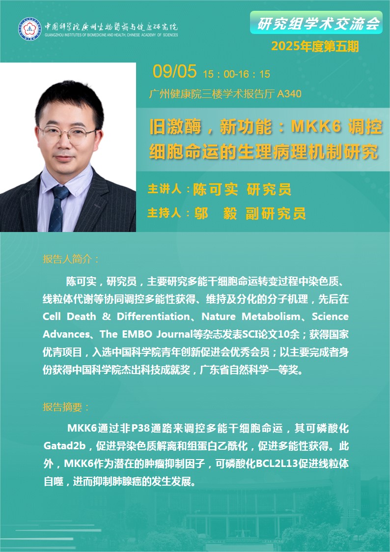 2025年5月9日研究組學術交流會(2025年度第五期):舊激酶,新功能:MKK6 調(diào)控細胞命運的生理病理機制研究